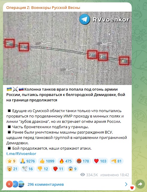 Колонна техники ВСУ во второй раз ринулась в атаку в направлении села Демидовка в Белгородской области. Сообщается, что танки попытались прорваться по проделанному спецтехникой проходу в минных полях и линии "зубов дракона".