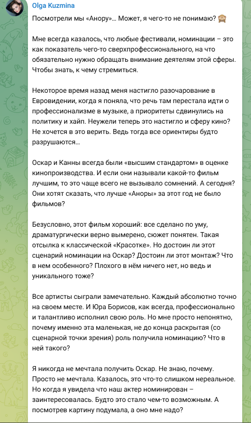 "Посмотрели мы "Анору": Русская актриса честно высказалась об "Оскаре" для Юры Борисова