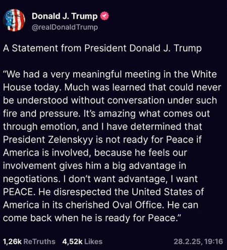 В частности, президент США "выяснил", что Зеленский не готов к миру. Потому что он считает участие Соединённых Штатов в переговорах огромным преимуществом - вместо того, чтобы видеть в этом возможность перехода к миру.