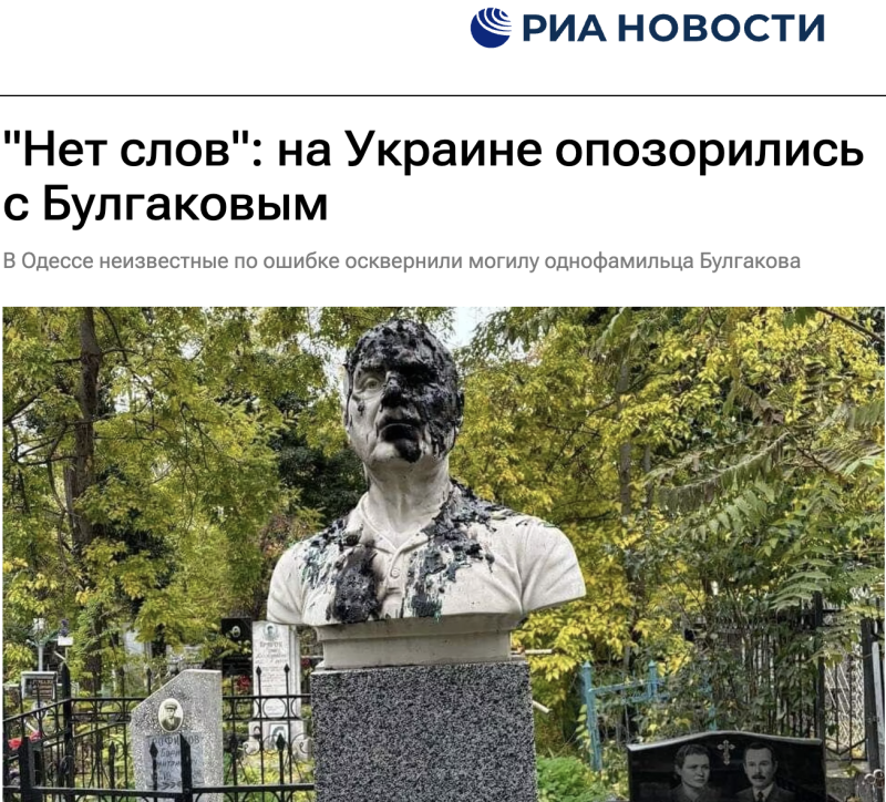Ранее в Одессе произошёл инцидент, который вызвал широкий резонанс: вандалы осквернили могилу Юрия Борисовича Булгакова, однофамильца известного писателя Михаила Булгакова. Вероятно, по ошибке. Об этом сообщила внучка покойного на своей странице в соцсетях, выразив своё потрясение произошедшим. Она обнародовала фотографии памятника до и после акта вандализма, а также видео, судя по кадрам которого бюст обливали чёрной вязкой субстанцией, напоминающей смолу.