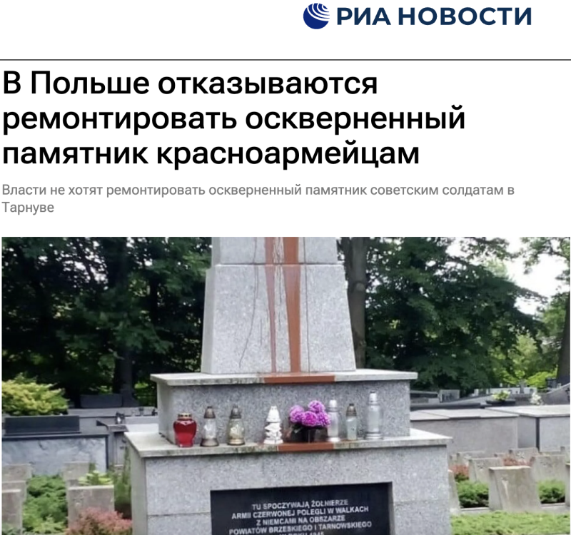 Не отстаёт и Польша, где сложилась непростая ситуация с памятником советским солдатам в Тарнуве. Мэр города Якуб Квасный сообщил, что памятник, установленный на кладбище, был повреждён: его облили коричневой краской и пытались оторвать гранитную звезду. Несмотря на "усилия" полиции, виновные так и не были найдены.