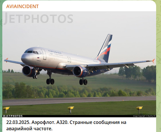 Как указывает Aviaincident, одним из самолётов, получивших этот сигнал, оказался Airbus A320, который 22 марта выполнял рейс из московского аэропорта Шереметьево в Магнитогорск. При приближении к Самаре лётчики приняли на аварийной частоте сигнал о пожаре в двигателе от воздушного судна с номером 97714. Это же сообщение поступило и экипажу другого борта - Airbus A320, который летел в Астану.