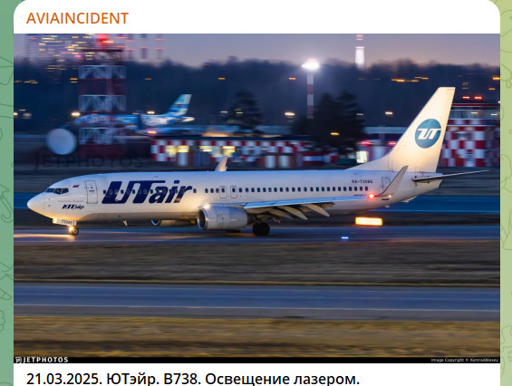 Ранее этот же ТГ-канал сообщал, что пилотов русской авиакомпании Utair попытались ослепить лазером в небе над Москвой. Инцидент произошёл с пассажирским Boeing 737-800, который выполнял рейс из Петербурга.