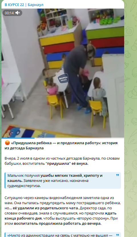 "Придушила ребёнка" и спокойно работала дальше. Камеры в частном детсаду Барнаула сняли страшную картину