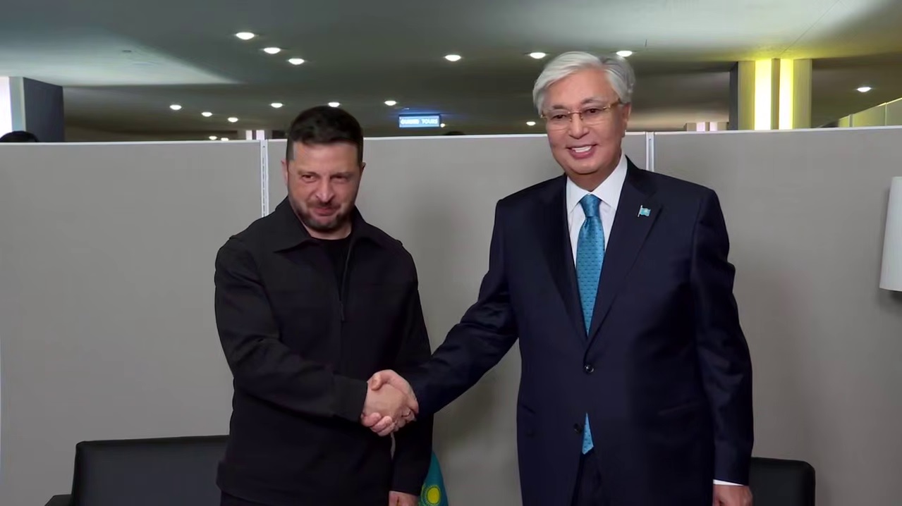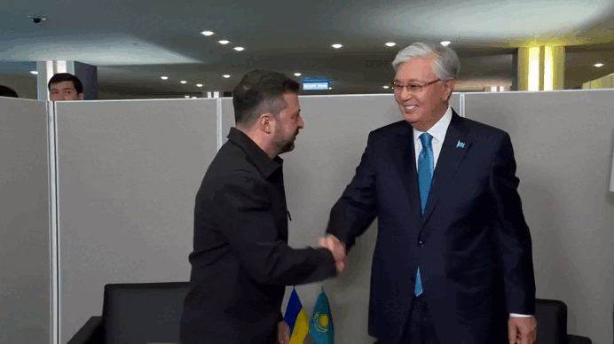 На этом фоне контрастом выступает видео встречи президента Казахстана с Владимиром Зеленским в Нью-Йорке. Разговор шёл на английском языке, хотя оба гораздо лучше говорят на русском. Также, по мнению некоторых аналитиков, Токаев вёл себя снисходительно в беседе с Зеленским.