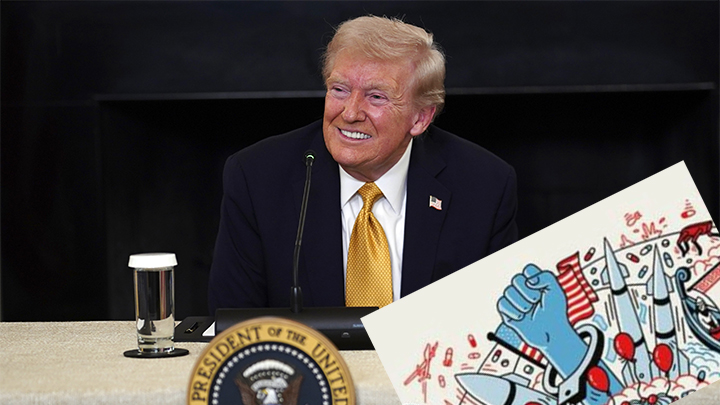 Важный акцент - на внутренние проблемы США, отмечающих 250-летний юбилей своей независимости в условиях нарастающего внутреннего конфликта и политического кризиса между республиканцами и демократами. Символ власти Трампа - рука в наручниках, закрывающая американский флаг, подчёркивает непредсказуемость американской политики.