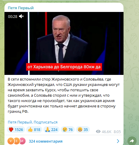 Вспоминая старые эфиры, пользователи соцсетей удивились, как точно Владимир Вольфович предсказал операцию ВСУ в Курской области. Тогда многие к его словам отнеслись скептически, а Соловьёва пророчество Жириновского и вовсе вывело из себя. "Очевидно, что никогда", - говорил телеведущий о шансах Украины на успех и оказался не прав.