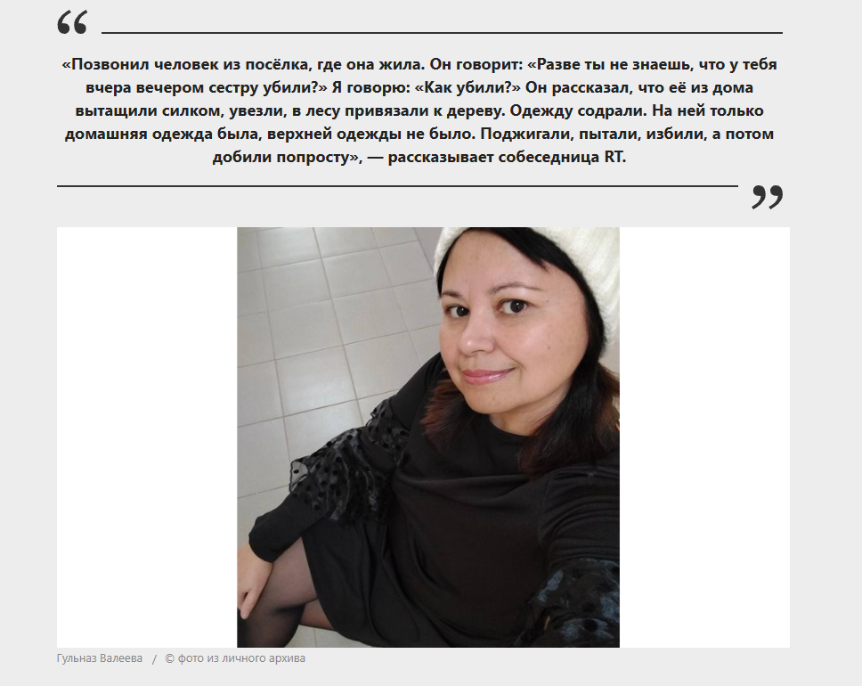 Однако обращение в полицию, видимо, совсем не охладило пыл "слуг народа". Особый цинизм этой истории придаёт также то, что Валеева была похищена, когда возвращалась с поминок брата, который погиб на фронте СВО.