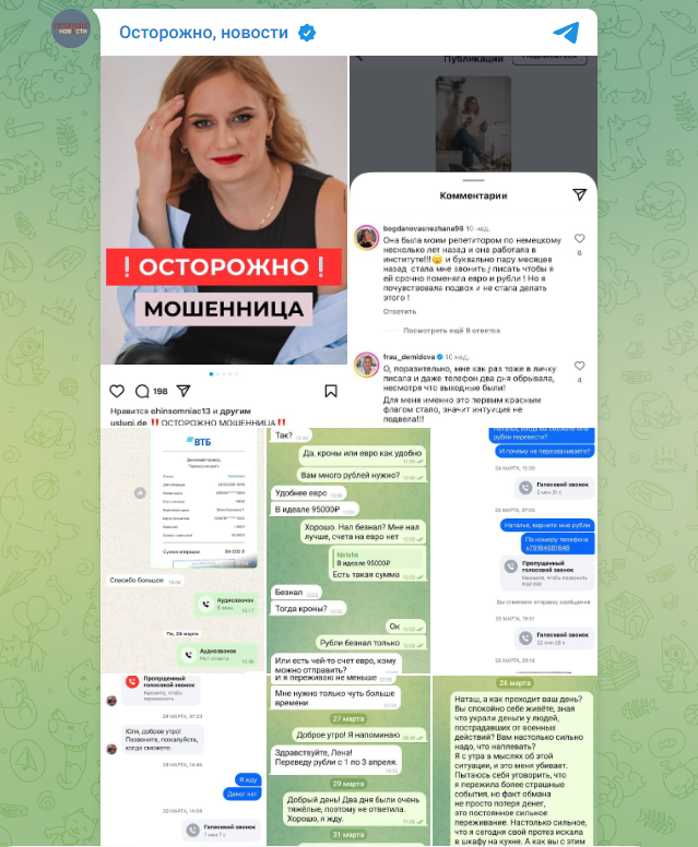 Другая делится историей, как отправила Наталье, якобы попавшей в безвыходную ситуацию, 700 евро, - они были отложены на оплату арендованной квартиры. Наталья, как всегда, клялась, что всё быстро вернёт. А потом перестала отвечать на сообщения и звонки.