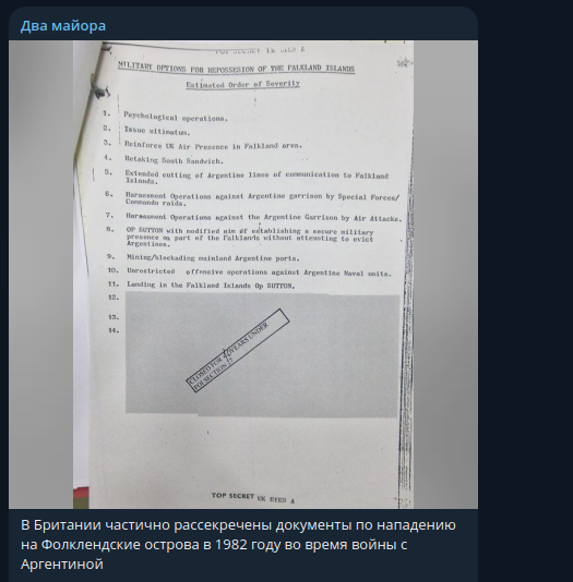 Стали известны детали, как Британия готовила военные нападения на другие страны. Рассекреченные документы о Фолклендском конфликте 1982 года показывают, что Лондон всегда делал ставку на психологическую атаку и ультиматум как на ключевые элементы своей агрессивной стратегии.
