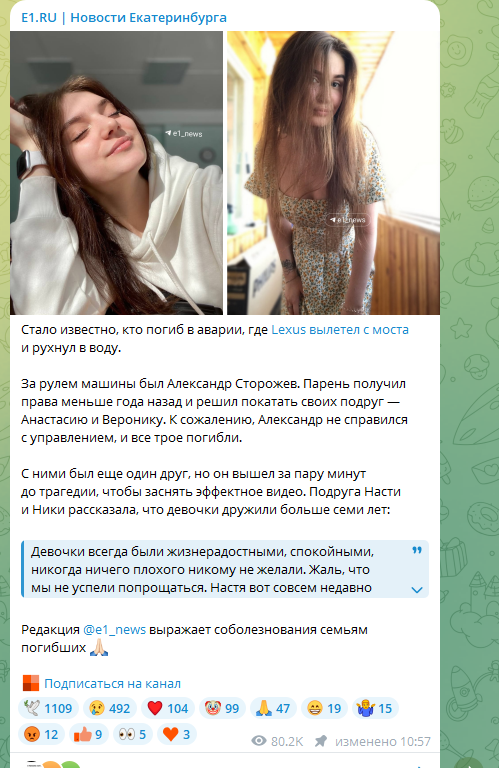 Снимать рискованный манёвр доверил другу. Высадил его за поворотом, а девушки остались в салоне. Парень разогнался и… с управлением справиться не смог. Войти в поворот не получилось. Машину на инерции потащило дальше, откинуло на ограждение, которое не выдержало, и она рухнула в реку.