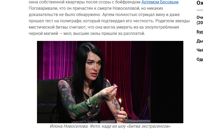 Одной из самых громких историй о загадочной смерти стала история Илоны Новосёловой. Дама практиковала чёрную магию и прославилась как одна из самых склочных участниц упомянутого шоу.