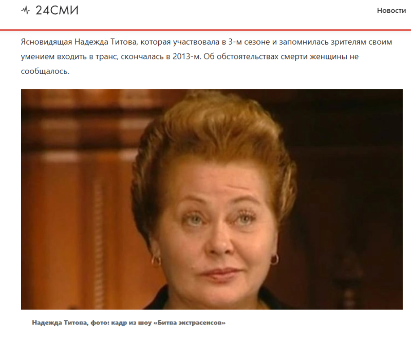 Участница третьего сезона шоу Надежда Титова считала себя профессиональным "экстрасенсом". В 2013-м году стало известно о её смерти, однако обстоятельства оной тщательно скрываются до сих пор.