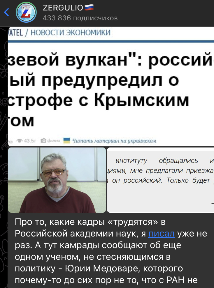 В Российской академии наук (РАН) продолжают трудиться учёные, чьи высказывания вызывают вопросы об их политической позиции. Одним из таких персонажей является 74-летний Юрий Медовар, кандидат геолого-минералогических наук и старший научный сотрудник Института водных проблем РАН.