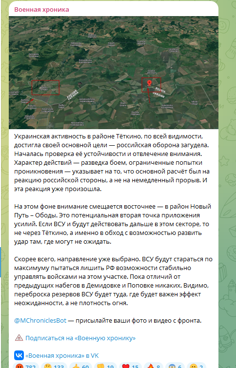 На этом фоне внимание смещается восточнее - в район Новый Путь - Ободы. Это потенциальная вторая точка приложения усилий. Если ВСУ и будут действовать дальше в этом секторе, то не через Тёткино, а именно в обход с возможностью развить удар там, где могут не ожидать,