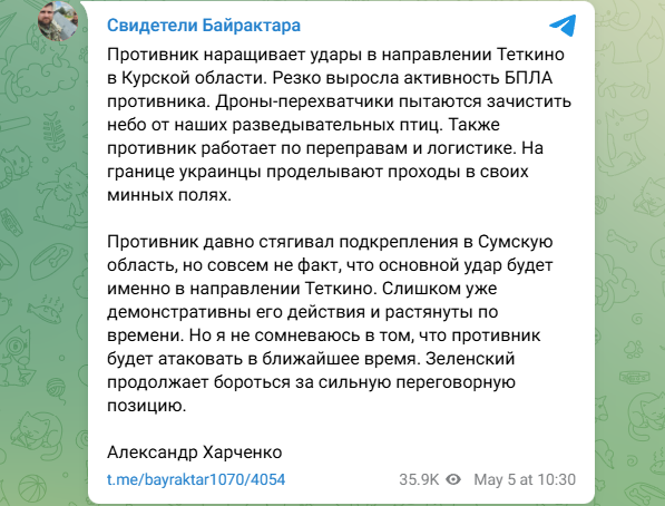 То, что враг стягивает дополнительные силы в Сумскую область, было отмечено нашими бойцами давно. При этом военкор также полагает, что атаки на Тёткино - то, что задумывалось противником как основная цель.
