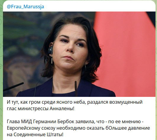 Либеральная демократия Байдена не пощадила либеральную демократию Бербок. Почему-то. Кстати, что там с расследованием?