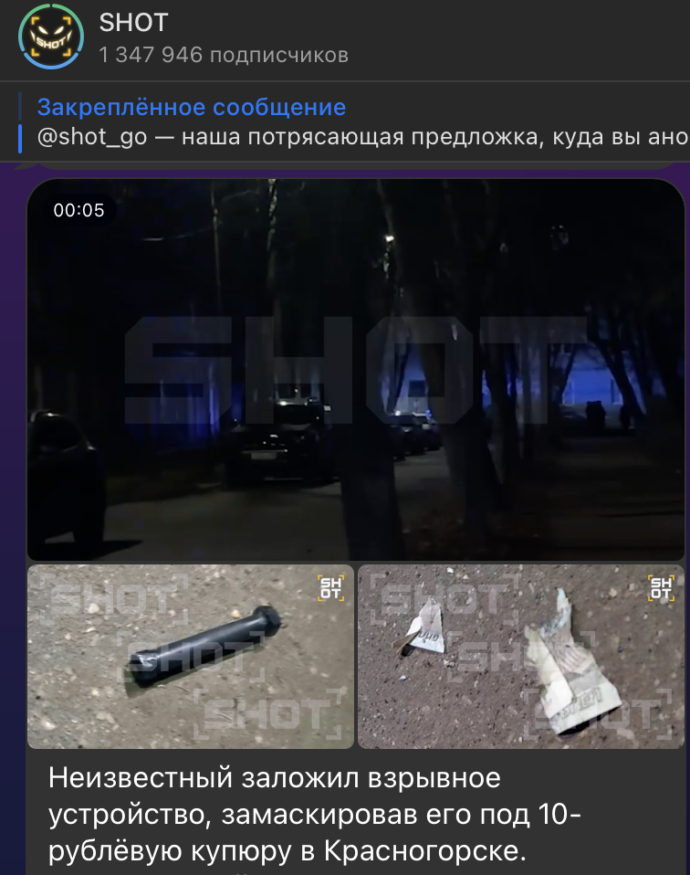 По данным телеграм-канала SHOT, такую же купюру с проводами внутри обнаружили дети в спальном районе Москвы ещё в начале 2024 года. Тогда сотрудники МЧС и взрывотехники не нашли ничего подозрительного. Обозреватели высказывают мнение, что, возможно, между этими эпизодами есть прямая связь.