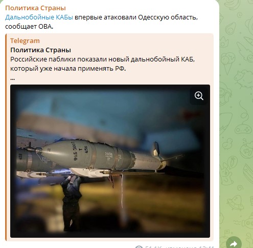 Мониторинговые каналы предупреждают: в случае успешной модификации модулей УМПБ реактивными двигателями (которые могут быть китайского производства), дальность полёта российских КАБов возрастёт до 350 км, что поставит Киев под угрозу. Между тем, в ОВА подтвердили первый удар КАБами по Одесской области. Руководитель администрации назвал это новой и колоссальной опасностью для области, несущей риск значительных разрушений,