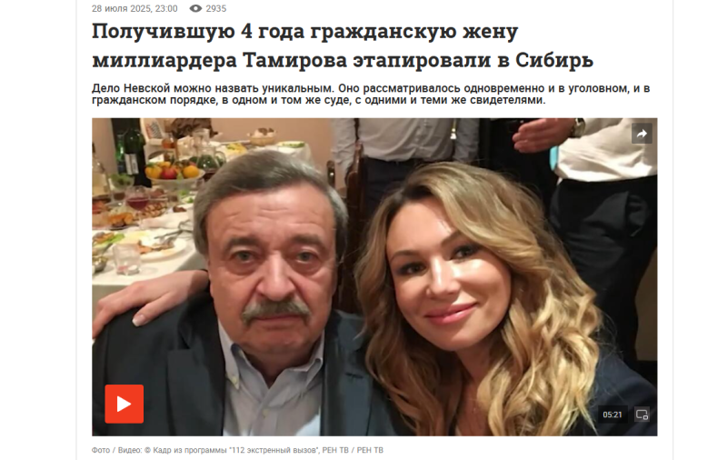 Но после его смерти наследники Тамирова (в том числе его законная супруга) сочли, что эти деньги Лилия присвоила. Итогом претензий и борьбы за миллиарды покойного богача стало то, что Невская села на скамью подсудимых. Недавно прозвучал обвинительный приговор: лишение свободы на 4 года с отбыванием наказания в колонии. Её уже этапировали в Новосибирск.