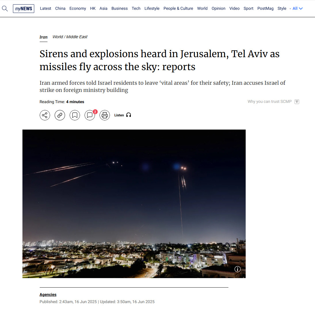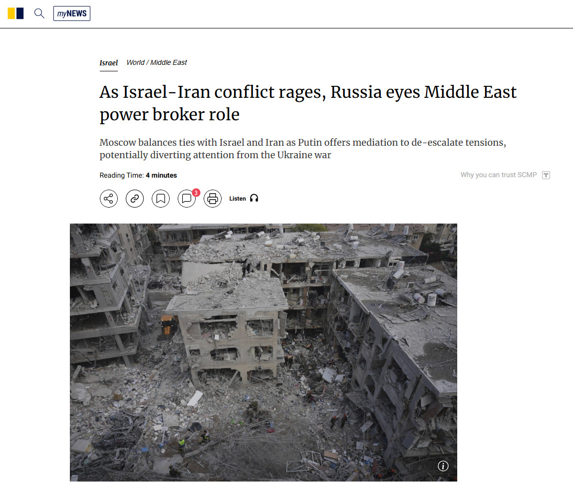 После ударов Израиля по иранским ядерным и военным объектам и ответного ракетно-дронового обстрела Тегерана Россия оказалась в щекотливом положении. Кремль осудил действия Израиля, выразил соболезнования Ирану, но явно не стремится испортить отношения с обоими. Наоборот - Владимир Путин предложил своё посредничество, рассчитывая не только продемонстрировать дипломатическую значимость Москвы, но и отвлечь внимание от конфликта на Украине, отмечает SCMP.