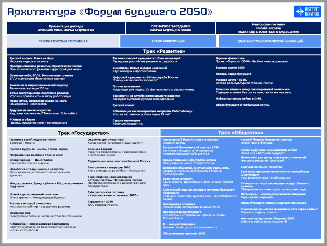 Форум откроется аналитическим обзором под названием "Россия 2050. Образ будущего", после чего пройдёт более 20 тематических секций, включая "Русский космос. Гонка за Марс", "Спецоперация "Демография" в горизонте 2050" и "Миграционная политика страны и роботизация как альтернатива миграции". В рамках "Менторской гостиной" состоятся дискуссии, где встретятся как признанные визионеры, так и новые лица в футурологии.