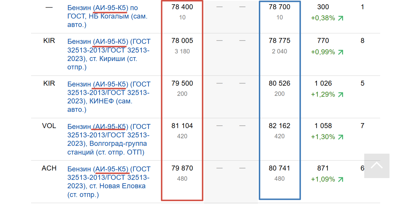 СТОИМОСТЬ РЯДА ЛОТОВ С БЕНЗИНОМ АИ-95 НА САНКТ-ПЕТЕРБУРГСКОЙ СЫРЬЕВОЙ БИРЖЕ. СТОЛБЕЦ В КРАСНОЙ РАМКЕ - ЦЕНЫ НА 5 АВГУСТА: РЯД ЛОТОВ СТОИЛИ И ДОРОЖЕ РЕКОРДНЫХ 78 ТЫСЯЧ РУБЛЕЙ. В СИНЕЙ РАМКЕ - ЦЕНЫ НА СЕРЕДИНУ ДНЯ 6 АВГУСТА: РОСТ ЦЕН, КАК ВИДНО, ПРОДОЛЖАЕТСЯ. СКРИНШОТ СТРАНИЦЫ САЙТА SPIMEX.COM