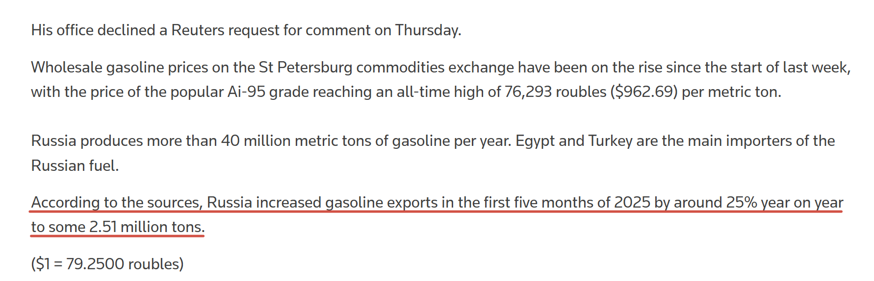 Но главный вопрос - почему? Первое и очевидное - экспорт. Российские нефтедобытчики и трейдеры слишком активно гонят бензин за рубеж, вымывая топливо с внутреннего рынка и провоцируя дефицит. По данным Reuters, только за первые пять месяцев 2025 года экспорт нефтепродуктов вырос примерно на четверть - до 2,51 млн тонн.