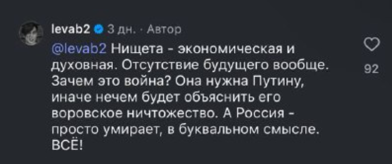 Это удивило интернет-пользователей, которые, в отличие от музыканта, живут в России и могут оценить реальное положение дел. Одна из пользовательниц отметила, что звёздные релоканты уже три года хоронят Россию, а она всё никак не умрёт.