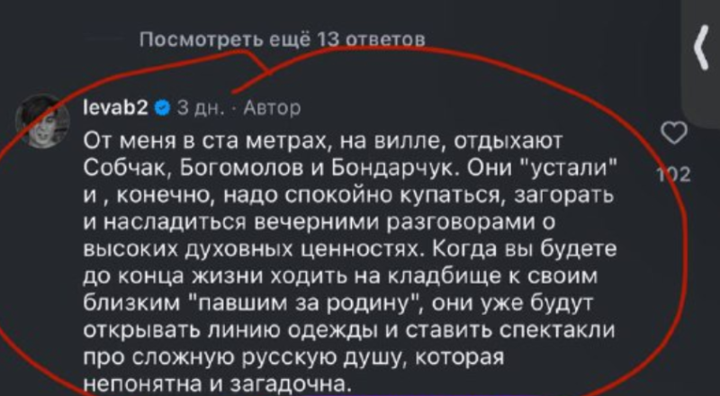 Он заявил, что в ста метрах от его дома в Испании отдыхают журналистка Ксения Собчак, её супруг - театральный режиссёр Константин Богомолов и кинорежиссёр Фёдор Бондарчук. Лёва Би-2* раскритиковал их за то, что они посмели отдыхать, купаться и загорать, пока русская армия бомбит Украину. Он также попытался настроить жителей России против творческой интеллигенции: