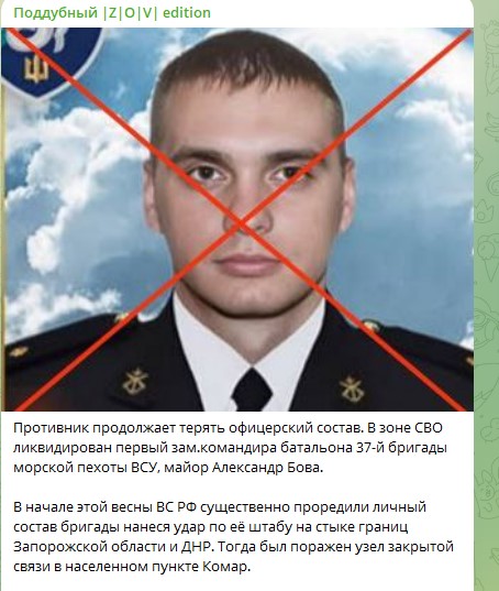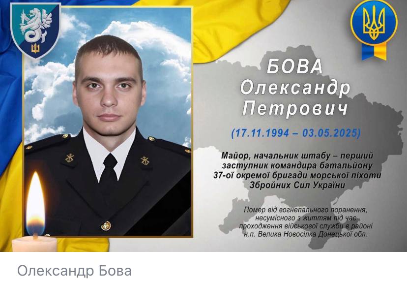 По данным украинских источников, 3 мая 2025 года в районе Великой Новосёлки в Донбассе был ликвидирован Александр Бова - майор, начальник штаба, первый заместитель комбата 37-й отдельной бригады морской пехоты. Ликвидированный боевик был уроженцем Полтавской области, сообщают местные СМИ. Уточняется, что до 2024 года Бова был пограничником и "охранял госграницы на разных КПП, в частности, в Приднестровье". В 2024 году 30-летний офицер уволился со службы на границе и пошёл воевать против русских, но недолго. Его жена осталась вдовой, детей они родить не успели.