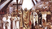 И совлёк с себя князь наш - вместе с одеждами - ветхого человека, отложил тленное, отряс прах неверия - и вошёл в святую купель. И возродился он от Духа и воды: во Христа крестившись, во Христа облёкся; и вышел из купели просветлённый, став сыном нетления, сыном воскресения... Впрочем, на этом не остановился он в подвиге благоверия, но повелел всему народу своему креститься... И тогда осветило землю нашу Солнце Евангелия.