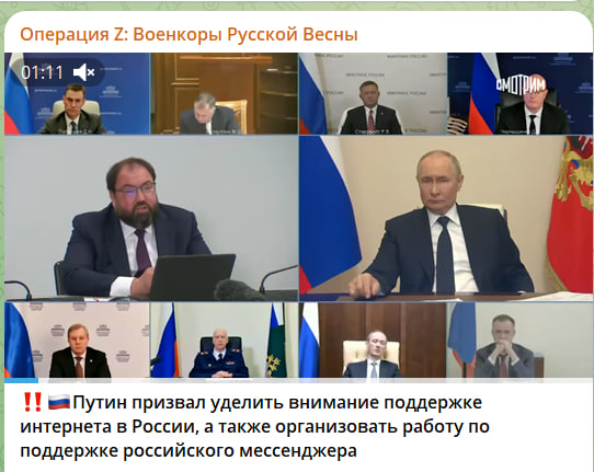 Владимир Путин призвал уделить внимание поддержке интернета в России, а также организовать работу по поддержке российского мессенджера.