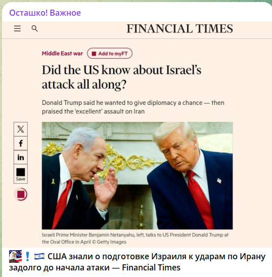 Британское издание Financial Times заявило, что США знали о подготовке Израиля к ударам по Ирану задолго до начала атаки. Информацию на условиях анонимности им подтвердил ряд высокопоставленных источников. По их мнению, администрация Трампа сознательно ввела Тегеран в заблуждение, давая понять, что готовится к новым переговорам, чтобы создать ложное чувство безопасности перед масштабной израильской операцией. Такая "уловка" сработала, считают дипломаты из арабских и западных кругов.