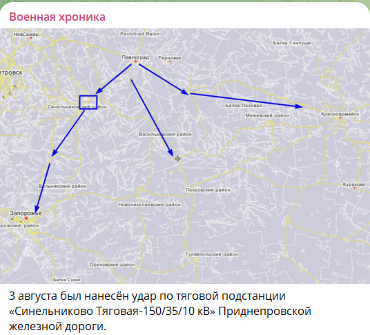 Кроме того, 3 августа был нанесён удар по тяговой подстанции "Синельниково Тяговая‑150/35/10 кВ" Приднепровской железной дороги. Подстанция обеспечивает движение составов с военными грузами и резервами на Запорожский фронт, а также снабжение группировок ВСУ в районе Покровска.