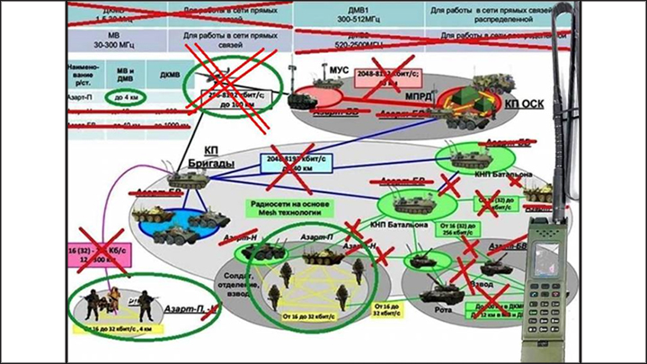 То есть радиостанции должны были быть на бойцах, на технике, на БМП, на танках и так далее. Также должны были быть узловые станции, ретрансляторы и так далее. И всё это должно было иметь связь со штабами, с беспилотниками, с авиацией, со всем остальным. И, соответственно, в таком формате боец превращался не просто в отдельную боевую единицу, а в элемент боевой сети. Таким образом он мог сообщить, навести артиллерийский удар, авиационный удар и так далее.