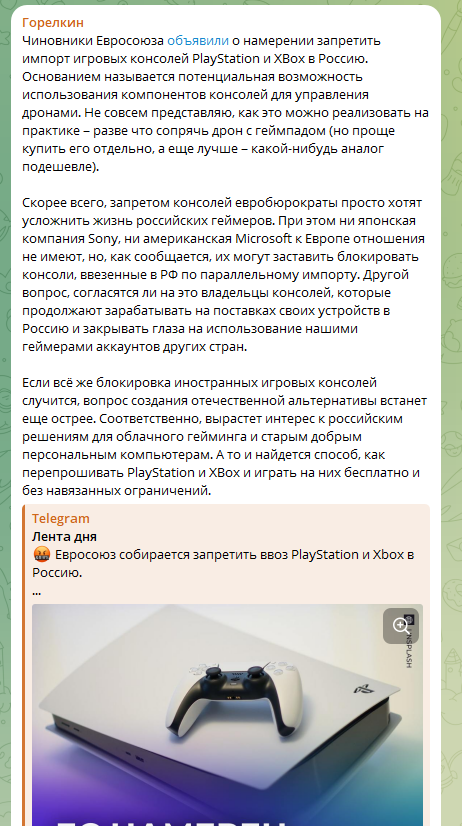 Среди прочего особенно выделяется запрет на импорт из Европы в Россию игровых приставок PlayStation и Xbox. Еврочиновники воображают, что эти девайсы русские используют для управления беспилотниками. Также под европейским запретом сейчас геймпады и авиасимуляторы.