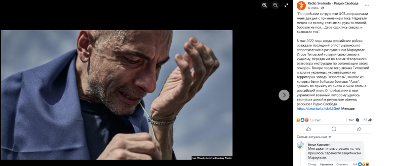 И вот теперь "Радио Свобода"** уже публикует рассказ некоего Игоря Титовского - боевика "Азова"*. Его взяли в плен на территории завода "Азовсталь". Как мы помним, позже эти пленные были освобождены в рамках обмена.