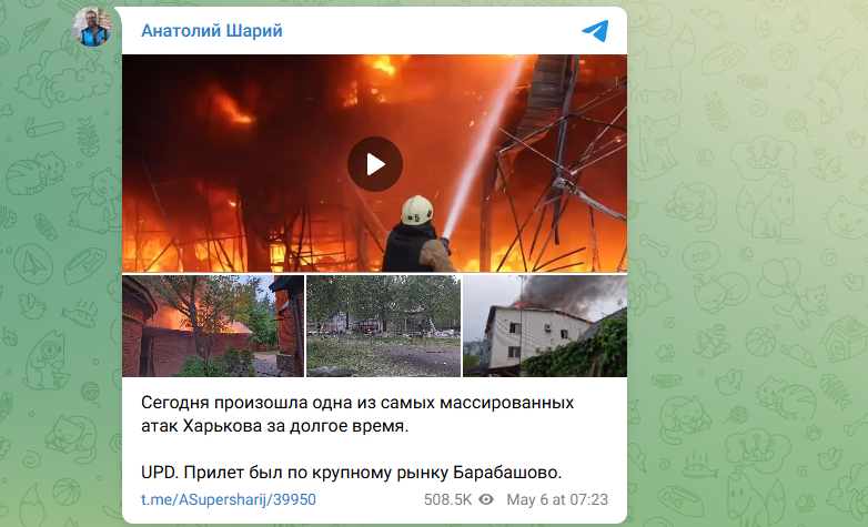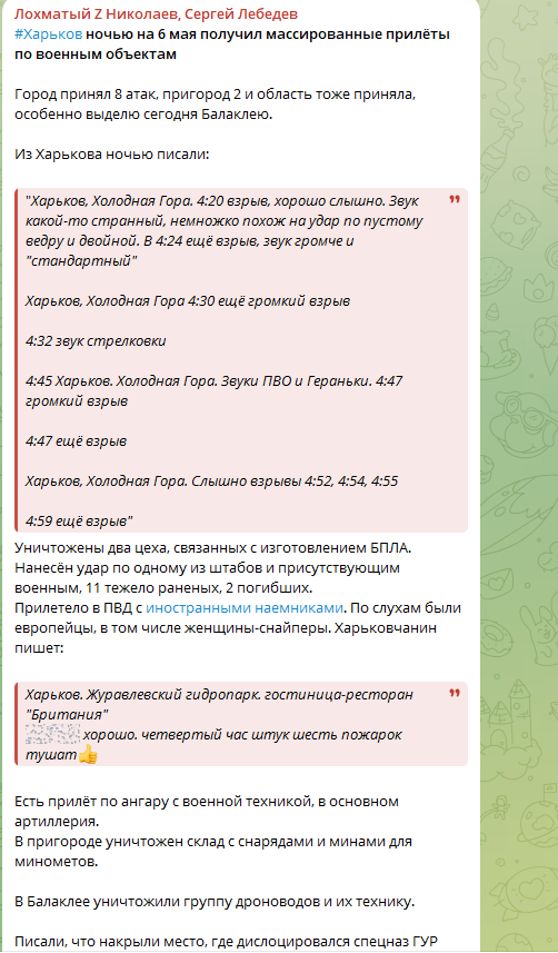 Ночь на 6 мая ознаменовалась атакой на Харьков. Там слышались взрывы - насчитали около десятка только крупных, особенно громких прилётов.