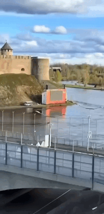 Напротив Нарвы, где расположен мост через одноимённую реку, служащий пограничным переходом между Эстонией и Россией, появились огромные экраны и большая сцена. Они были установлены в рамках подготовки к празднованию Дня Победы.