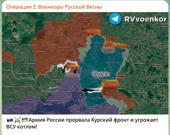 По данным "Военкоров Русской весны", армия России прорвала Курский фронт и угрожает ВСУ котлом, который почти схлопнулся: