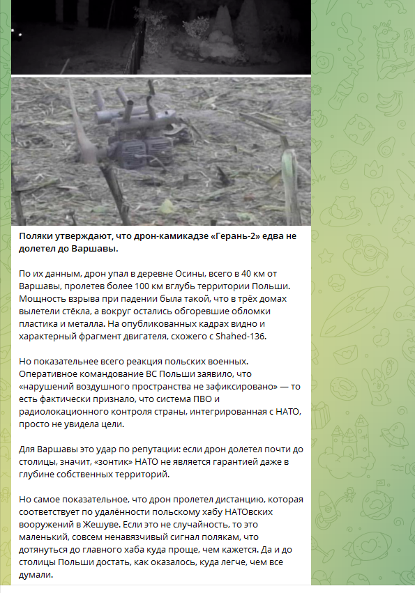 Несколько дней назад Польша внезапно заявила, что дрон-камикадзе "Герань-2" едва не добрался аж до Варшавы. Польская сторона утверждает: русский БПЛА якобы упал в районе деревни Осины (это около 40 км от Варшавы). Якобы при этом заряд дрона сдетонировал, и в трёх домах выбило стёкла от ударной волны.