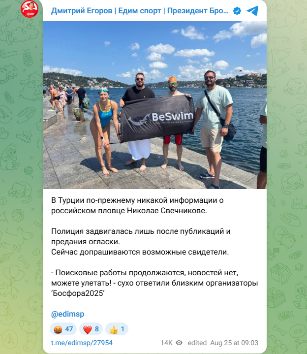 Русский спортсмен Николай Свечников пропал без вести, переплывая Босфор. Профессиональный пловец хотел исполнить заветную мечту - покорить пролив. Однако на финише его недосчитались, причём, по данным СМИ, организаторы мероприятия не сразу забили тревогу. Журналист Дмитрий Егоров негодует: "Полиция задвигалась лишь после публикаций и огласки".