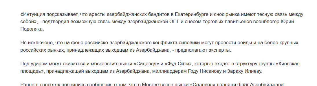 Любопытно, что недавно в Екатеринбурге прошли аресты участников этнической ОПГ, вызвавшие острую реакцию в Баку. Настолько острую, что Азербайджан пошёл на резкое ухудшение отношений с Россией.