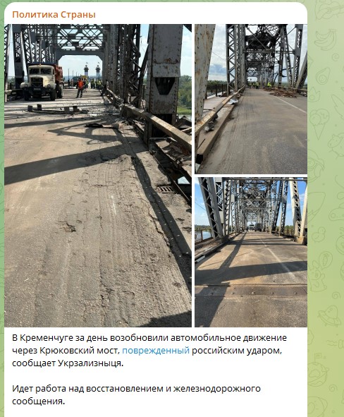 В подтверждение слов аналитиков о маломощном ударе по мосту украинские СМИ утром 8 сентября сообщили о возобновлении автомобильного сообщения через повреждённый мост. Уточняется, что идёт работа над восстановлением и железнодорожного сообщения.