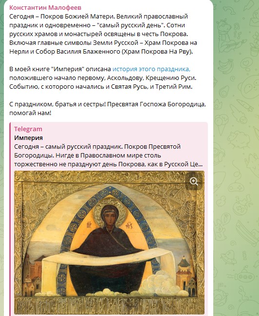 - написал в своём телеграм-канале основатель "Первого русского" Константин Малофеев, напомнив о том, что сотни русских храмов и монастырей освящены в честь Покрова.