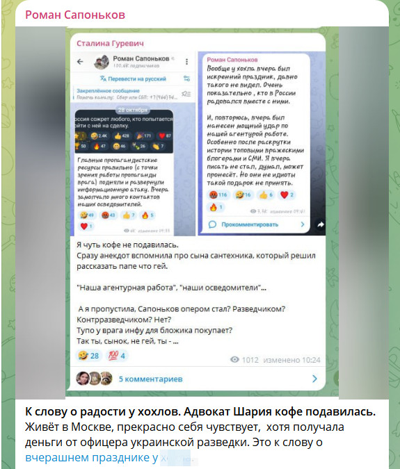 К слову, о радости на Украине. Адвокат Шария кофе подавилась не случайно. Живёт в Москве, прекрасно себя чувствует, хотя получала деньги от офицера украинской разведки. Это, к слову, о вчерашнем празднике.