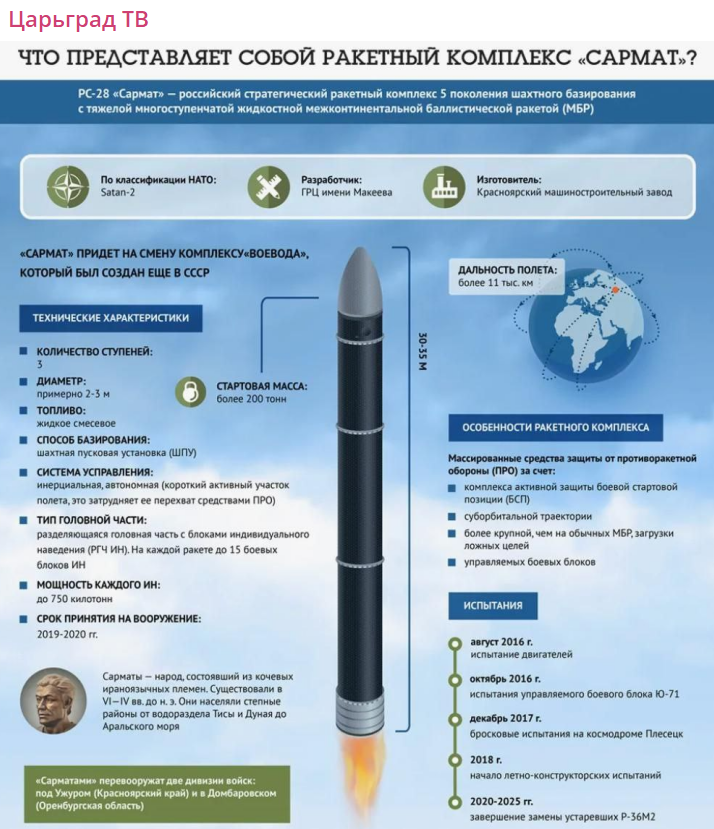 Тяжёлая баллистическая ракета "Сармат" должна заменить в войсках старые советские ракеты "Воевода". Дальность полёта "Сармата" - до 18 тыс. км. Каждая ракета может нести до 15 боезарядов, включая гиперзвуковые блоки "Авангард". Вкупе это позволяет данному оружию поражать любую точку на планете.