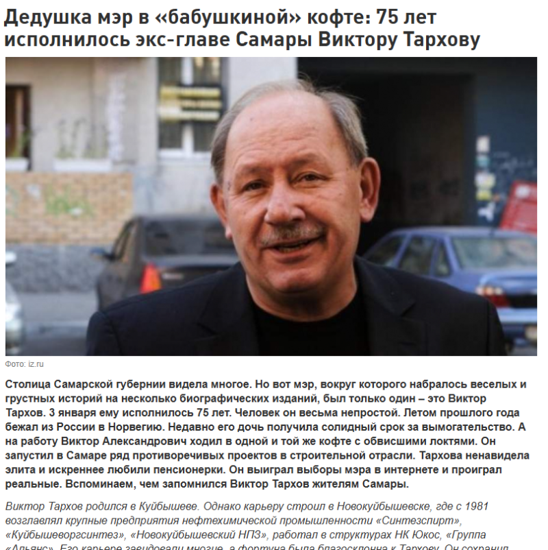 В позапрошлом году самарские издания писали, что Тархов отметил 75-летний юбилей. Тогда же вспоминали, что "дедушка-мэр в бабушкиной кофте" (такое прозвище в бытность градоначальником юбиляр получил за странный стиль одежды) перебрался в Норвегию.