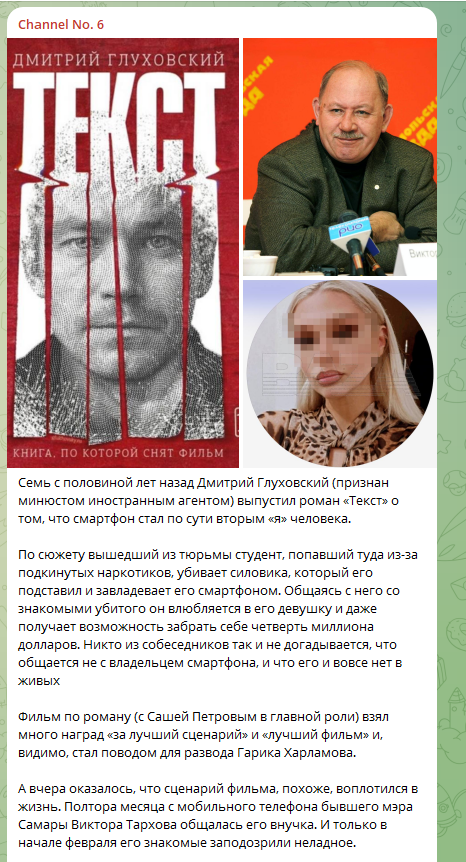 Леденящая душу криминальная история произошла в Самаре. Бывший мэр города Виктор Тархов и его жена Наталья найдены застреленными, а по подозрению в убийстве задержана их внучка. При этом сообщается: подозреваемая полтора месяца успешно скрывала исчезновение деда и бабки. От имени Тархова она общалась по его телефону, создавая видимость, что всё с мужчиной и его женой в порядке. В Сети полагают: вот так уродливо воплотился в жизнь сценарий скандального фильма "Текст". Там убивший продажного полицейского бывший зэк тоже много недель скрывал злодеяние, используя для этого телефон покойного.